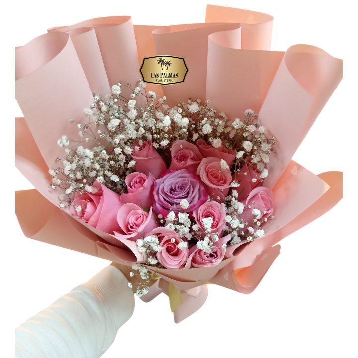 Este encantador bouquet combina delicadas rosas rosadas y lila con un toque etéreo de gypso (flor de nube), todo envuelto en un elegante papel rosa mate y lazo satinado. Su diseño romántico y fresco lo convierte en el regalo ideal para expresar amor, gratitud o ternura en cualquier ocasión especial.