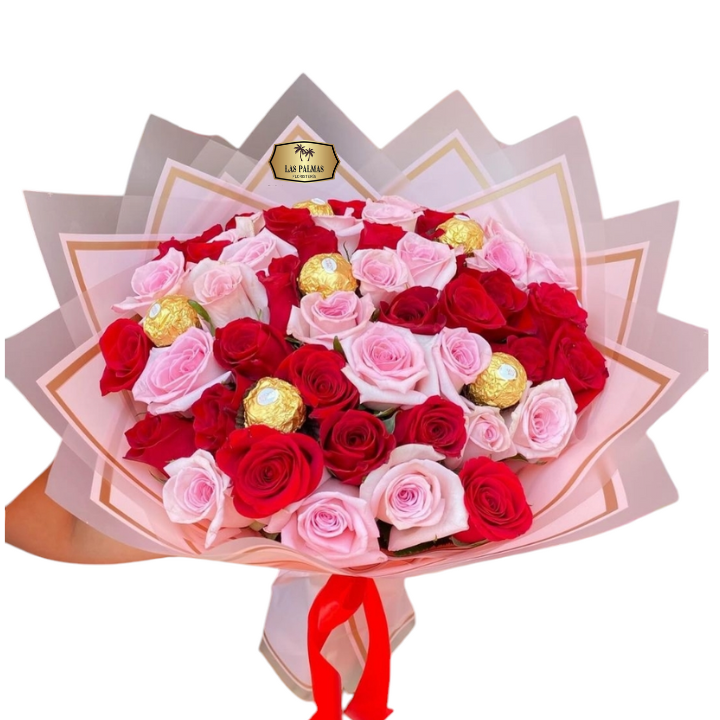 Nuestro bouquet de rosas color rosado y rojo combinado con chocolates ferrero es la forma perfecta de expresar tus sentimientos más profundos.